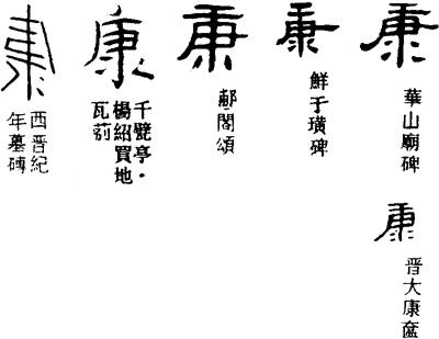 〈辨〉康字甲骨文、金文上部从庚,郭沫若认为庚即是钲,一种有耳可摇的乐器,详庚字下;下面两旁之点,象示所发出的声音。本义当为和乐,安乐。篆书作从米庚声,本为谷皮的糠的初文,借用为康乐字。楷书讹变作康。