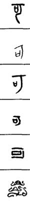 从上到下依次是小篆、甲骨文、金文、古玺及战国文字、缪篆及汉代文字、鸟虫篆。