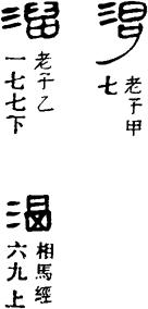 从上到下依次是小篆、甲骨文、金文、古玺及战国文字、缪篆及汉代文字、鸟虫篆。