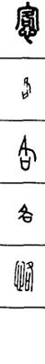 从上到下依次是小篆、甲骨文、金文、古玺及战国文字、缪篆及汉代文字、鸟虫篆。