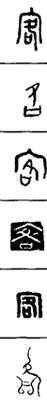 从上到下依次是小篆、甲骨文、金文、古玺及战国文字、缪篆及汉代文字、鸟虫篆。