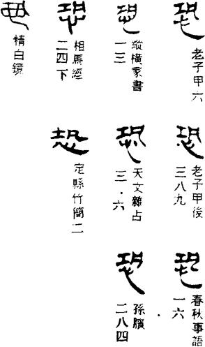 从上到下依次是小篆、甲骨文、金文、古玺及战国文字、缪篆及汉代文字、鸟虫篆。