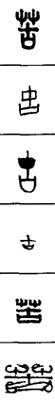 从上到下依次是小篆、甲骨文、金文、古玺及战国文字、缪篆及汉代文字、鸟虫篆。