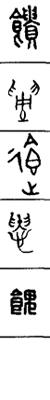 从上到下依次是小篆、甲骨文、金文、古玺及战国文字、缪篆及汉代文字、鸟虫篆。