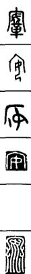 从上到下依次是小篆、甲骨文、金文、古玺及战国文字、缪篆及汉代文字、鸟虫篆。