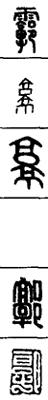 从上到下依次是小篆、甲骨文、金文、古玺及战国文字、缪篆及汉代文字、鸟虫篆。