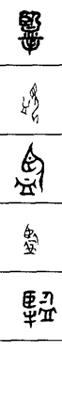 从上到下依次是小篆、甲骨文、金文、古玺及战国文字、缪篆及汉代文字、鸟虫篆。