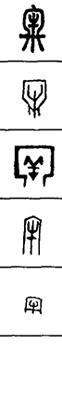 从上到下依次是小篆、甲骨文、金文、古玺及战国文字、缪篆及汉代文字、鸟虫篆。