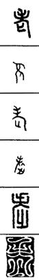 从上到下依次是小篆、甲骨文、金文、古玺及战国文字、缪篆及汉代文字、鸟虫篆。