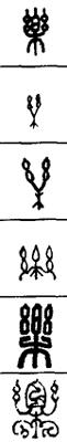 从上到下依次是小篆、甲骨文、金文、古玺及战国文字、缪篆及汉代文字、鸟虫篆。