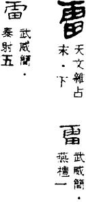 léi 《广韵》:说文作“靁”,云,阴阳薄、动雷雨,生物者也。 鲁回切 蟹合一平灰来