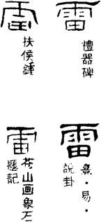 〈辨〉雷字甲骨文从电,雷、电同时产生,电光可象示雷声不可象示,旁加圆形象示雷声,喻示空中有物撞击。金文中象示雷声的二圆形改为四田,田非田地之田;上加雨为形符,雷雨也往往相因。篆书从雨畾声,畾读léi。楷书简化作雷。