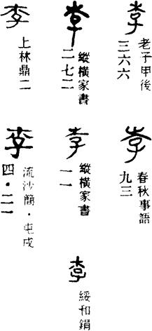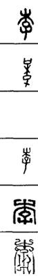 从上到下依次是小篆、甲骨文、金文、古玺及战国文字、缪篆及汉代文字、鸟虫篆。