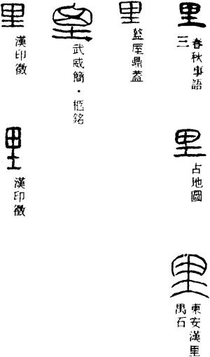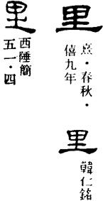 ,加邑为形符,但是没有成功,仍写作里,引申为义项①等。里1义旧作里。裹字从衣里声,本义为衣服内层,里2义都是由它引申。异体裡,只是同裹字配合部位不同。今并用里。