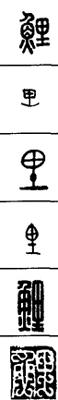 从上到下依次是小篆、甲骨文、金文、古玺及战国文字、缪篆及汉代文字、鸟虫篆。