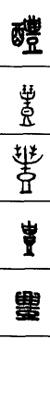 从上到下依次是小篆、甲骨文、金文、古玺及战国文字、缪篆及汉代文字、鸟虫篆。