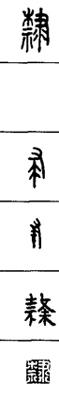 从上到下依次是小篆、甲骨文、金文、古玺及战国文字、缪篆及汉代文字、鸟虫篆。