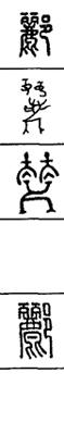 从上到下依次是小篆、甲骨文、金文、古玺及战国文字、缪篆及汉代文字、鸟虫篆。
