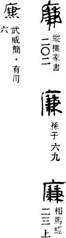 〈辨〉廉字从广,本义为堂基的侧边,引申为狭窄。又引申为方正廉洁字。异体廉、廉都是由它讹变而成;今并作廉。
