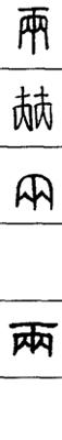 从上到下依次是小篆、甲骨文、金文、古玺及战国文字、缪篆及汉代文字、鸟虫篆。