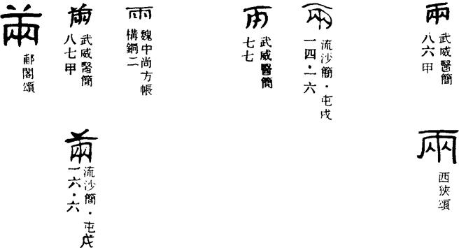 金文辭一車稱一兩,小盂鼎:“孚(俘)車卅兩。”小臣宅坭:“白(伯)易(賜)小臣宅畫干戈九(厹)昜(鍚)金車馬兩。”早期文獻依然。《尚書·牧誓序》:“武王戎車三百兩。”孔氏傳:“車稱兩。”孔穎達疏:“稱車之法,一車謂之一兩。《詩》云:‘百兩迓之。’是車稱兩也。《風俗通》説,車有兩輪,故稱為兩,猶履有兩隻亦稱為兩。”又睡虎地秦簡《金布律》:“都官有秩吏及離官嗇夫,養各一人……十五人,車牛一兩,見牛者一人。”