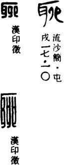 从上到下依次是小篆、甲骨文、金文、古玺及战国文字、缪篆及汉代文字、鸟虫篆。