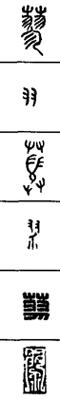 从上到下依次是小篆、甲骨文、金文、古玺及战国文字、缪篆及汉代文字、鸟虫篆。