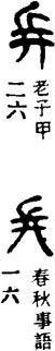【说明】“兵”为会意字,由“艹”(像双手形)和“斤”(斧子类兵器)组成,表示兵器的意思。参附录三。