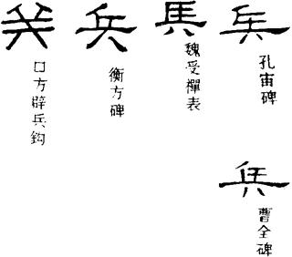 〈辨〉兵字篆书作象双手持斤之形,本义为武器,引申指战士。楷书讹变作兵。