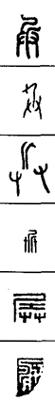 从上到下依次是小篆、甲骨文、金文、古玺及战国文字、缪篆及汉代文字、鸟虫篆。