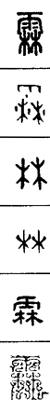 霖的本义为久雨。《说文解字》:“霖,雨三日已往。从雨,林声。”意谓雨下三天以上即为霖。霖字从雨林声,在结构上似属于形声字,但甲骨文的霖字,分明是由雨、林会意,象雨洒林间、树木间水滴淋淋之形,当属会意字,只不过林又兼作声符,故霖字应是一个会意兼形声的字。