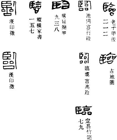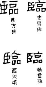 金文的临字,象人俯视众物之形。小篆的临从卧从品,卧象俯视人形,其下为众物,其会意与金文同。因此,临的本义指俯视,引申为面对、降临、到、及等义,又引申为统管、治理。
