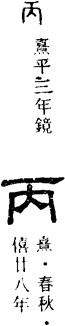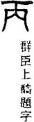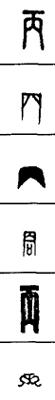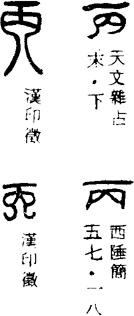 〈辨〉丙字金文形体象古时兵器柄下端的鐏,借用为天干字。篆书上加一横,稍讹。