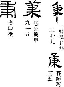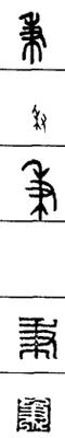 从上到下依次是小篆、甲骨文、金文、古玺及战国文字、缪篆及汉代文字、鸟虫篆。