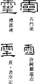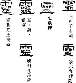 S.1086《兔園策府》:“鬯黍合其一稃,靈茅籍其三脊。”“夫以軒黃駕象,總會百靈;夏禹登山,朝宗万國。”按:《顏氏家訓·書證》:“世間小學者,不通古今,必依小篆,是正書記;凡《爾雅》、《三蒼》、《說文》,豈能悉得蒼頡本指哉?亦是隨代損益,互有同異。西晉以往字書,何可全非?但令體例成就,不爲專輒耳。考校是非,特須消息。……自有訛謬,過成鄙俗,‘亂’旁爲‘舌’,‘揖’下無‘耳’,‘鼋’、‘鼉’從‘龜’,‘奮’、‘奪’從‘雚’,‘席’中加‘帶’,‘惡’上安‘西’,‘鼓’外設‘皮’,‘鑿’頭生‘毀’,‘離’則配‘禹’,‘壑’乃施‘豁’,‘巫’混‘經’旁,‘臯’分‘澤’片,‘獵’化爲‘獦’,‘寵’變爲‘寵’,‘業’左益‘片’,‘靈’底著‘器’;‘率’字自有‘律’音,強改爲別;‘單’字自有‘善’音,輒析成異:如此之類,不可不治。”此即“靈”底著“器”者。顏元孫《干祿字書》:“