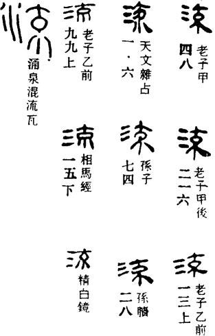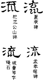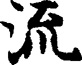 小篆的流字,两边为水,中间一个倒“子”形,子的头部是飘散的头发,表示一个人顺水漂流的意思。流的本义为流动,即水向下游移动,引申为移动、流传、传布、传递、放逐等义;又指水流、河道,引申为流派、支流及品级之义。