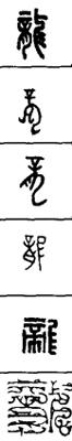 从上到下依次是小篆、甲骨文、金文、古玺及战国文字、缪篆及汉代文字、鸟虫篆。