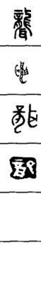 从上到下依次是小篆、甲骨文、金文、古玺及战国文字、缪篆及汉代文字、鸟虫篆。