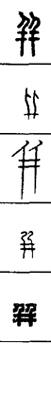 〈辨〉并字来源有三:一是竝,甲骨文象二人并排站立,篆书从二立会意,楷书作並。义项①②③④,原来都写作並。二是并,甲骨文在从字下部加一画或两画,象示二人并行或归并的意思;篆书讹作从从幵声,幵读jīan;楷书讹作并,简作并。并本为义项⑤的初字,后来用併字表示,从人并声。並、竝、併,三字都为并1的异体。并2字专门借作并州字。现在一概写作并。
