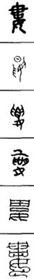 从上到下依次是小篆、甲骨文、金文、古玺及战国文字、缪篆及汉代文字、鸟虫篆。