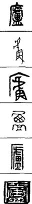 从上到下依次是小篆、甲骨文、金文、古玺及战国文字、缪篆及汉代文字、鸟虫篆。