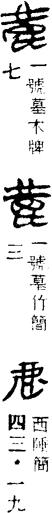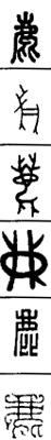 从上到下依次是小篆、甲骨文、金文、古玺及战国文字、缪篆及汉代文字、鸟虫篆。