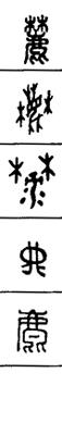 从上到下依次是小篆、甲骨文、金文、古玺及战国文字、缪篆及汉代文字、鸟虫篆。