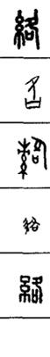 从上到下依次是小篆、甲骨文、金文、古玺及战国文字、缪篆及汉代文字、鸟虫篆。