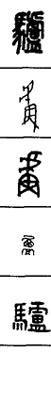 从上到下依次是小篆、甲骨文、金文、古玺及战国文字、缪篆及汉代文字、鸟虫篆。