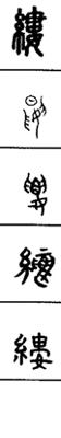 从上到下依次是小篆、甲骨文、金文、古玺及战国文字、缪篆及汉代文字、鸟虫篆。