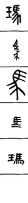 从上到下依次是小篆、甲骨文、金文、古玺及战国文字、缪篆及汉代文字、鸟虫篆。