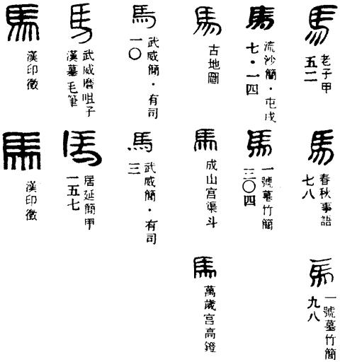 马是一种哺乳动物,善跑耐重,是人类最早驯养的六畜之一。甲骨文的马字,象一头身足尾俱全的侧视马形。金文的马字则主要突出马眼和马鬃。汉字中凡从“马”的字大多与马、马属动物及其动作、功能有关,如驰、驹、骆、腾、骄、驴等。