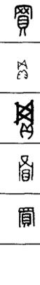 从上到下依次是小篆、甲骨文、金文、古玺及战国文字、缪篆及汉代文字、鸟虫篆。