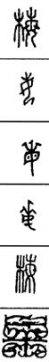 从上到下依次是小篆、甲骨文、金文、古玺及战国文字、缪篆及汉代文字、鸟虫篆。